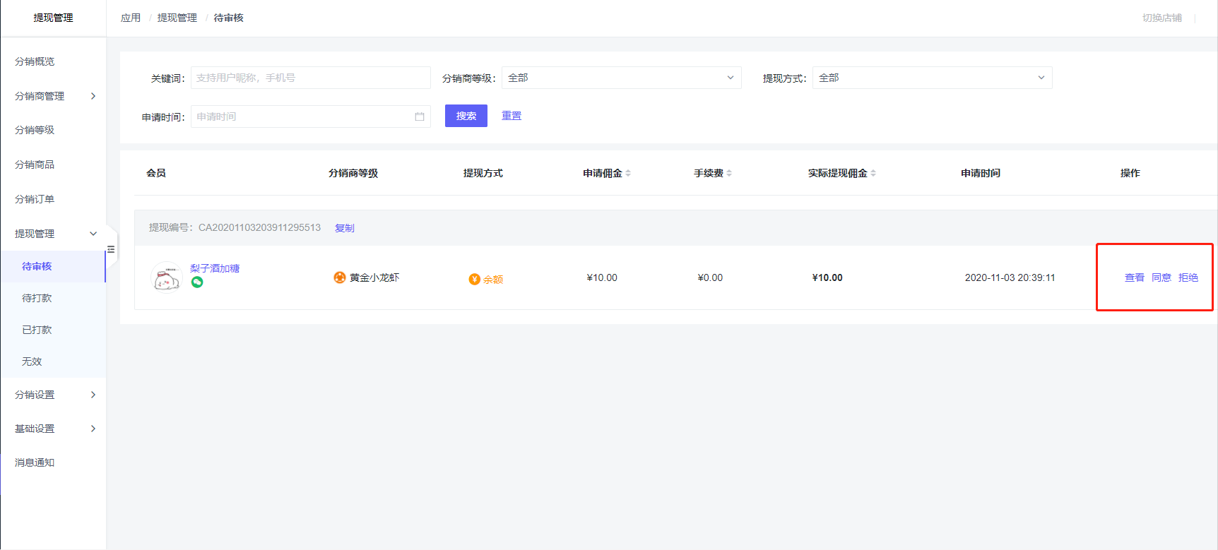 - 分销商申请提现后,平台进行佣金审核和打款:可在列表页快速通过或拒绝申请,也可点击查看核对详细的信息后进行审核
