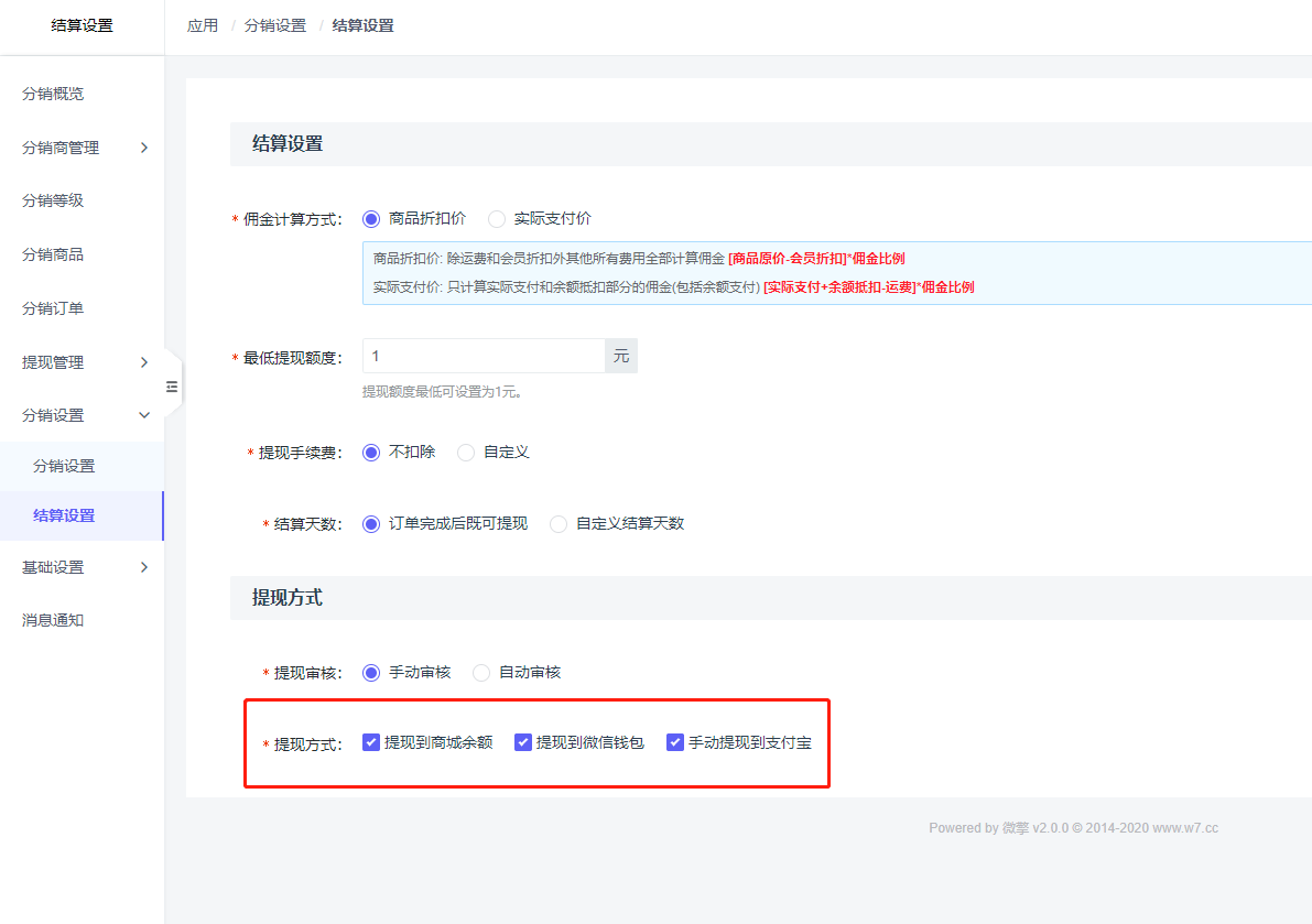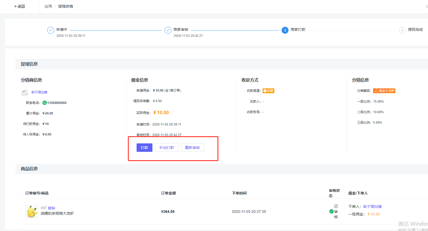 - 审核后进行佣金打款:可自动打款,手动打款,重新审核(手动打款需向分销商线下转账交易)