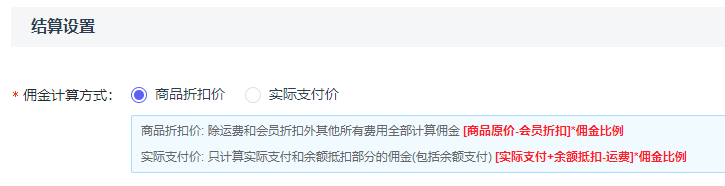 - 实际支付价: 只计算实际支付和余额抵扣部分的佣金(包括余额支付)[实际支付(余额支付)+余额抵扣-运费)*佣金比例